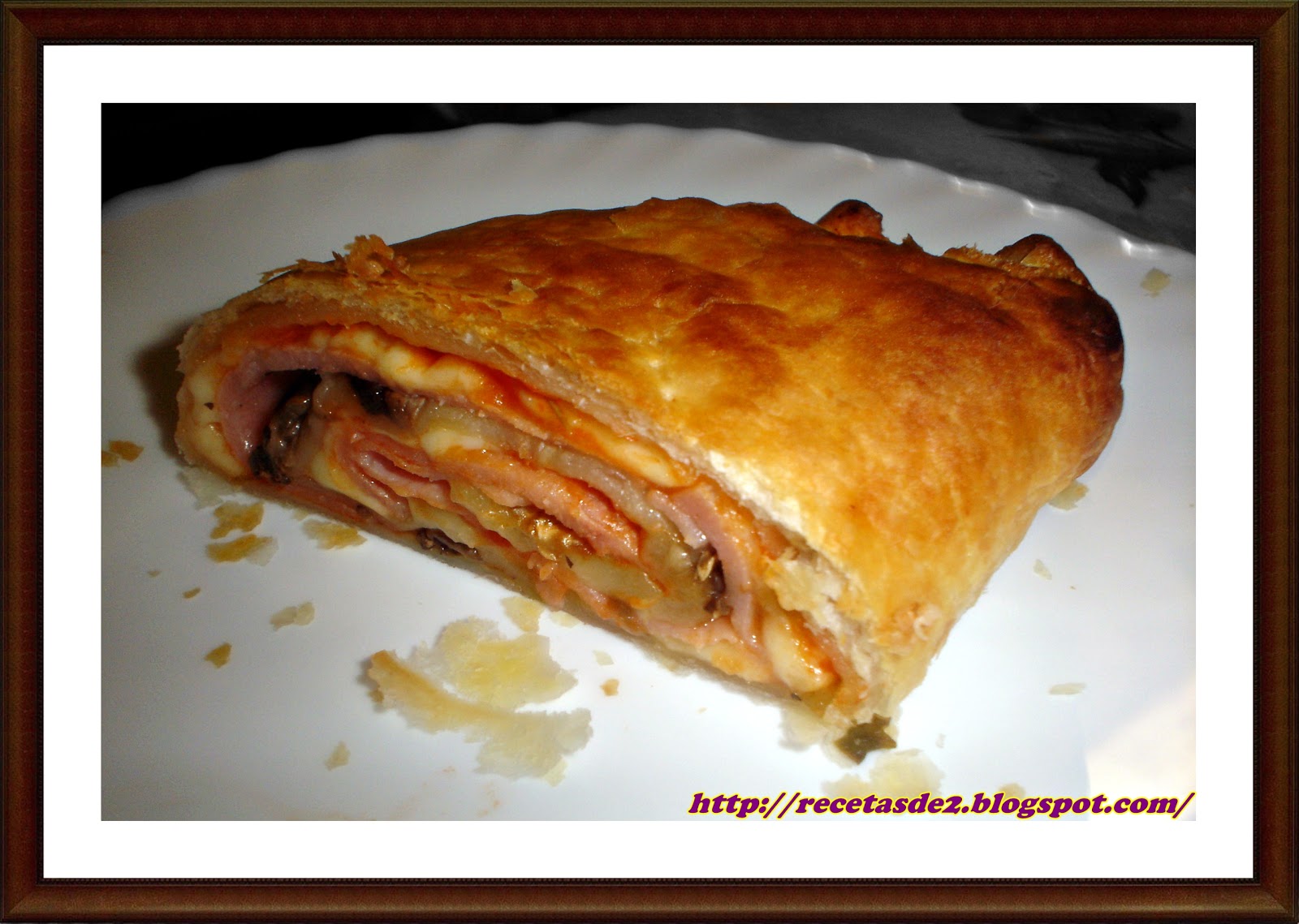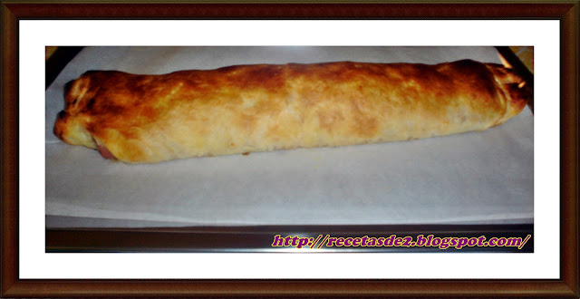 Esta es una versión del típico brazo de hojaldre con relleno de Pizza. A los niños les encanta y puede ser una merienda o cena estupenda para estas Navidades... llenas de visitas y carreras de niños jugando por todas partes.