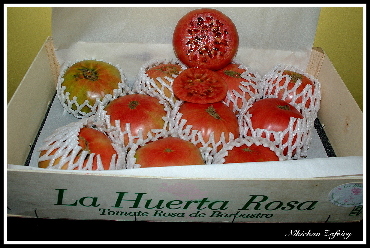 Para esta receta he utilizado Tomates Rosas de Barbastro "La Huerta Rosa". Se trata de un producto Gourmet de alta gama. Ya está abierta la temporada 2013 de recolección y venta del auténtico Tomate Rosa de Barbastro. El mejor tomate del mundo, del huerto a casa en 24-48 horas. Un imprescindible de la dieta Mediterránea. Los tomates de La Huerta Rosa se venden en cajas de madera de diseño exclusivo y con una presentación cuidada y especial. Podemos comprarlos en una caja de 5 kg de Tomates Rosas de Barbastro a 35 euros (IVA y transporte incluidos).