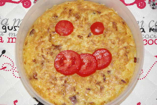 Las calorías de la receta intentaremos que se marchen nadando y paseando mucho, porque está muy rica y de vez en cuando si se puede. El tomate era por alegrar la tortilla tanto como yo antes de salir de casa...
